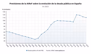 La Autoridad Independiente de Responsabilidad Fiscal (AIReF) prevé una disminución en la ratio de deuda sobre PIB de 2,6 puntos sobre el nivel registrado en 2022, que situarían la ratio en el 110,6% a finales del año.