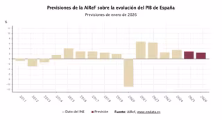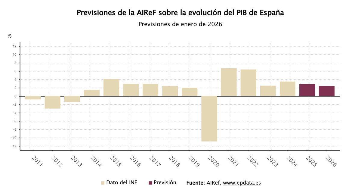 La Autoridad Independiente de Responsabilidad Fiscal (AIReF) ha revisado al alza la previsión del PIB del 2026 desde el 2,1% hasta el 2,4%, al tiempo que ha subrayado que la incertidumbre "no debe ser obstáculo" para presentar los Presupuestos Generales del Estado (PGE).
