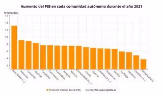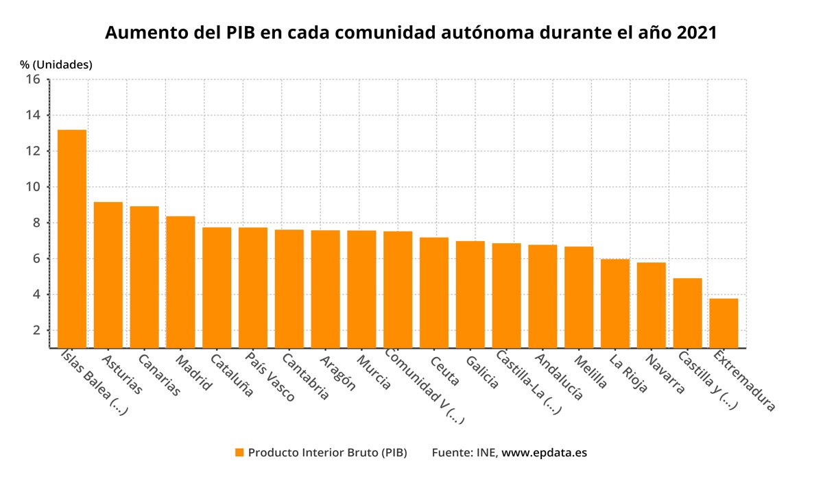 En el otro extremo, con los incrementos menos acusados, se sitúan Castilla y León (+4,3%) y Aragón (-4,4%). En las ciudades autónomas de Ceuta y Melilla, el crecimiento del PIB fue incluso algo más bajo, del 4% y del 4,1%, respectivamente.