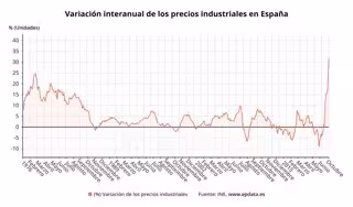En España, según datos publicados por el Instituto Nacional de Estadística (INE), los precios industriales subieron un 6,1% el pasado mes de octubre en relación al mes anterior, su mayor alza mensual de toda la serie histórica, y se dispararon un 31,9% en tasa interanual, más de ocho puntos por encima de la de septiembre y crecimiento récord en 45 años.