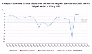 Para 2024, el Banco de España ha revisado una décima a la baja su previsión de crecimiento, hasta el 2,2%, como reflejo, fundamentalmente, de un endurecimiento de las condiciones de concesión de crédito más intenso de lo anticipado en marzo, mientras que mantiene en el 2,1% la de 2025.