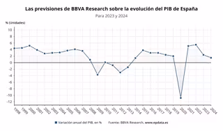 BBVA Research ha mantenido su previsión de crecimiento del Producto Interior Bruto (PIB) para España en 2023 en el 2,4%, pero ha revisado tres décimas a la baja su proyecciones para 2024 hasta el 1,5% y prevé una aceleración del crecimiento en 2025, hasta el 2,5%.