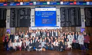 Bolsa y Mercados Españoles, el operador de los valores y sistemas financieros en España, celebró un 'toque de campana' este jueves por la mañana en la Bolsa de Madrid con motivo del Día Internacional de la Mujer.