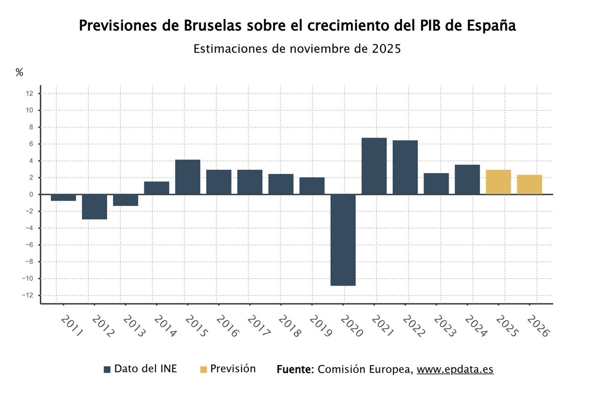 La Comisión Europea es el último organismo internacional en revisar al alza sus previsiones de crecimiento para España, que el pasado mes de octubre ya vio mejorado el pronóstico del Fondo Monetario Internacional (FMI), que ahora espera una expansión del 2,9% este año y del 2% en 2026, mientras que en septiembre la Organización para la Cooperación y el Desarrollo Económico (OCDE) elevó su pronóstico de crecimiento para España en 2025 al 2,6% y al 2% para 2026.