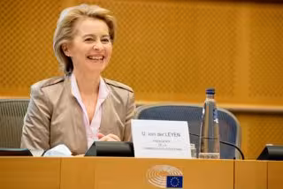 HANDOUT - 23 June 2020, Belgium, Brussels: European Commission President Ursula von der Leyen reacts during a joint press conference with President of European Parliament David Sassol (not pictured). Photo: Etienne Ansotte/European Commission/dpa - ATTE - Etienne Ansotte/European Commiss / DPA