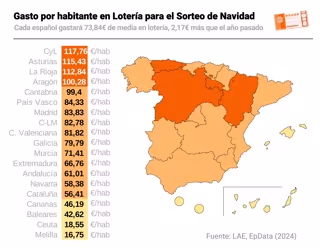 Mientras, según los datos recogidos por Europa Press, los que menos van a gastarse este año son nuevamente los habitantes de las ciudades autónomas de Melilla (16,75 euros) y Ceuta (18,55 euros), seguidos de los de Baleares (42,62 euros), Canarias (46,19 euros), Cataluña (56,41 euros), Navarra (58,38 euros), Andalucía (61,01 euros), Extremadura (66,76 euros) y Murcia (71,41 euros).