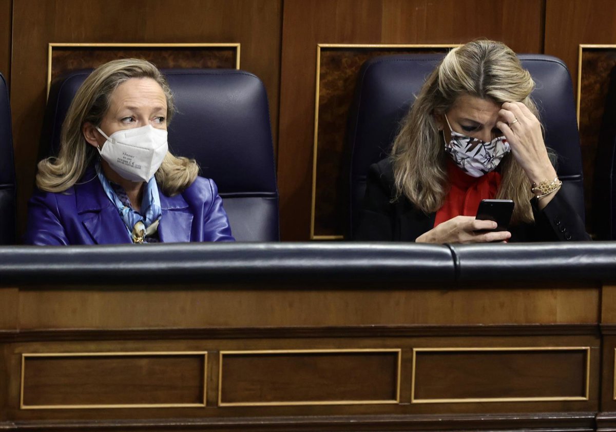 La vicepresidenta primera y ministra de Asuntos Económicos, Nadia Calviño (i); la vicepresidenta segunda del Gobierno y ministra de Trabajo y Economía Social, Yolanda Díaz, en una sesión plenaria en el Congreso - Eduardo Parra - Europa Press