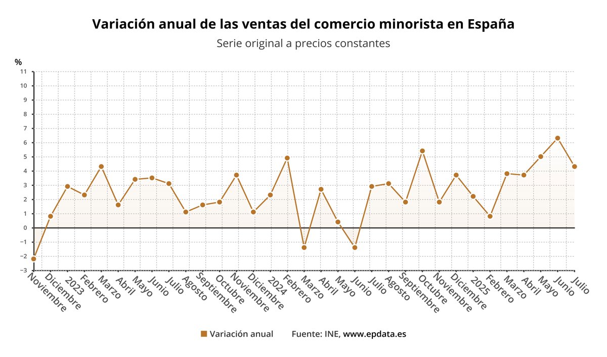 Las ventas del comercio al por menor registraron un avance interanual del 4,3% en julio, tasa dos puntos inferior a la del mes anterior, según ha informado este viernes el Instituto Nacional de Estadística (INE).