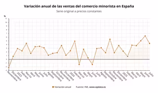 En los siete primeros meses del año, las ventas del comercio minorista se han incrementado una media del 3,8% respecto al mismo periodo de 2024 (+4,3% en la serie corregida), destacando los avances de las grandes cadenas (+5,9%) y del comercio electrónico (+3,3%).
