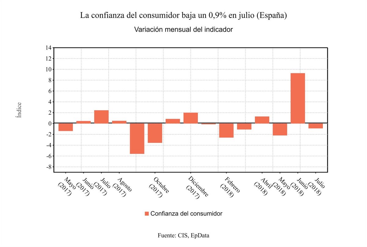 Comparando los datos de julio de este año con los del mismo mes de 2017, la evolución de la confianza del consumidor es negativa y en todos sus componentes, ya que decrece 2,2 puntos, tras caer el índice de la valoración de la situación actual 1,7 puntos y 2,7 puntos el de las expectativas.