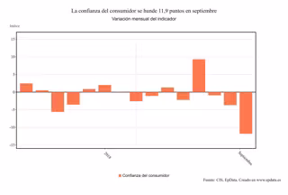 MADRID, 3 Oct. (EUROPA PRESS) - La confianza del consumidor bajó 11,9 puntos en septiembre en relación al mes anterior, hasta situarse en 90,6 puntos, su peor dato en dos años, según los datos publicados este miércoles por el Centro de Investigaciones Sociológicas (CIS). Este fuerte retroceso de la confianza del consumidor en el noveno mes del año se debe, sobre todo, a la peor valoración de la situación actual que hacen los ciudadanos y, en menor medida, a la caída de sus expectativas. De este modo, la confianza de los consumidores vuelve a bajar de los 100 puntos después de tres meses consecutivos por encima de esta cifra. La percepción de los consumidores se entiende así como negativa, ya que para considerarla positiva debe estar por encima de los 100 puntos. Dentro de los dos indicadores que componen el índice de la confianza del consumidor, el de situación actual registró un retroceso de 16,3 puntos, hasta los 82,9 puntos, su nivel más bajo desde octubre de 2016. Por su parte, el indicador de expectativas bajó 7,4 puntos en septiembre, hasta los 98,2 puntos, su peor dato desde septiembre de 2016. Dentro del indicador de situación actual, la valoración de los consumidores sobre la evolución general de la economía se hundió 22 puntos y la del mercado de trabajo empeoró en 20,1 puntos. También cayó, aunque de forma más moderada, la percepción sobre la situación de los hogares, con una contracción de 6,9 puntos. Por su lado, el retroceso de las expectativas de los ciudadanos es resultado de la disminución en 12,7 puntos de la valoración sobre la evolución futura de la economía, de la caída en 7 puntos de las expectativas sobre el empleo y del descenso en 2,5 puntos de la valoración sobre la situación futura de los hogares. Comparando los datos de septiembre de este año con los del mismo mes de 2017, la confianza del consumidor retrocedió 12,6 puntos, tras bajar el índice de situación actual en 12,9 puntos y el de expectativas, en 12,4 puntos. El ICC recoge mensualmente la valoración de la evolución reciente y las expectativas de los consumidores españoles relacionadas con la economía familiar y el empleo, con el objetivo de anticipar sus decisiones de consumo. El indicador recoge valores de entre 0 y 200, considerándose que por encima de 100 la percepción es positiva y por debajo, negativa.