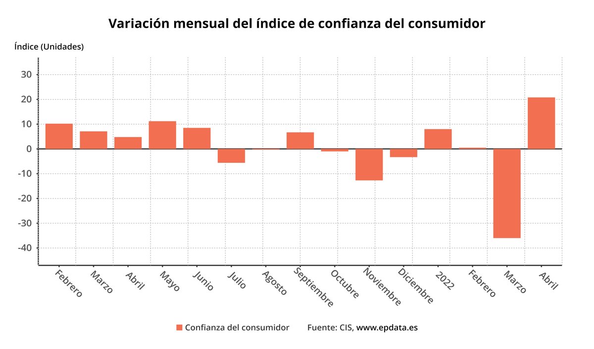 Este fuerte repunte contrasta con el desplome de 36 puntos que sufrió la confianza el mes anterior y devuelve a este indicador a la senda de ascensos, que se vio truncada en marzo tras producirse la invasión rusa de Ucrania.