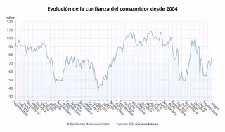 En cuanto a la evolución anual, el Índice de Confianza del Consumidor sube 5,5 puntos respecto a mayo de 2022, cuando se situaba en 76 puntos.