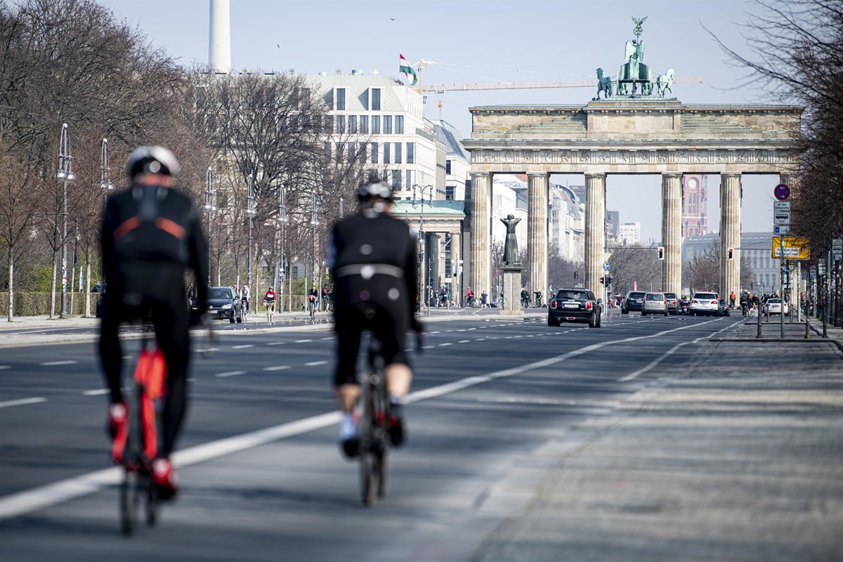 Archivo - 28 March 2020, Berlin: Two cyclists ride on the Strasse des 17. Juni (17th of June Street) in the direction of the Brandenburg Gate. In order to slow down the spread of the coronavirus (COVID-19), the federal government has considerably restri - Fabian Sommer/dpa - Archivo