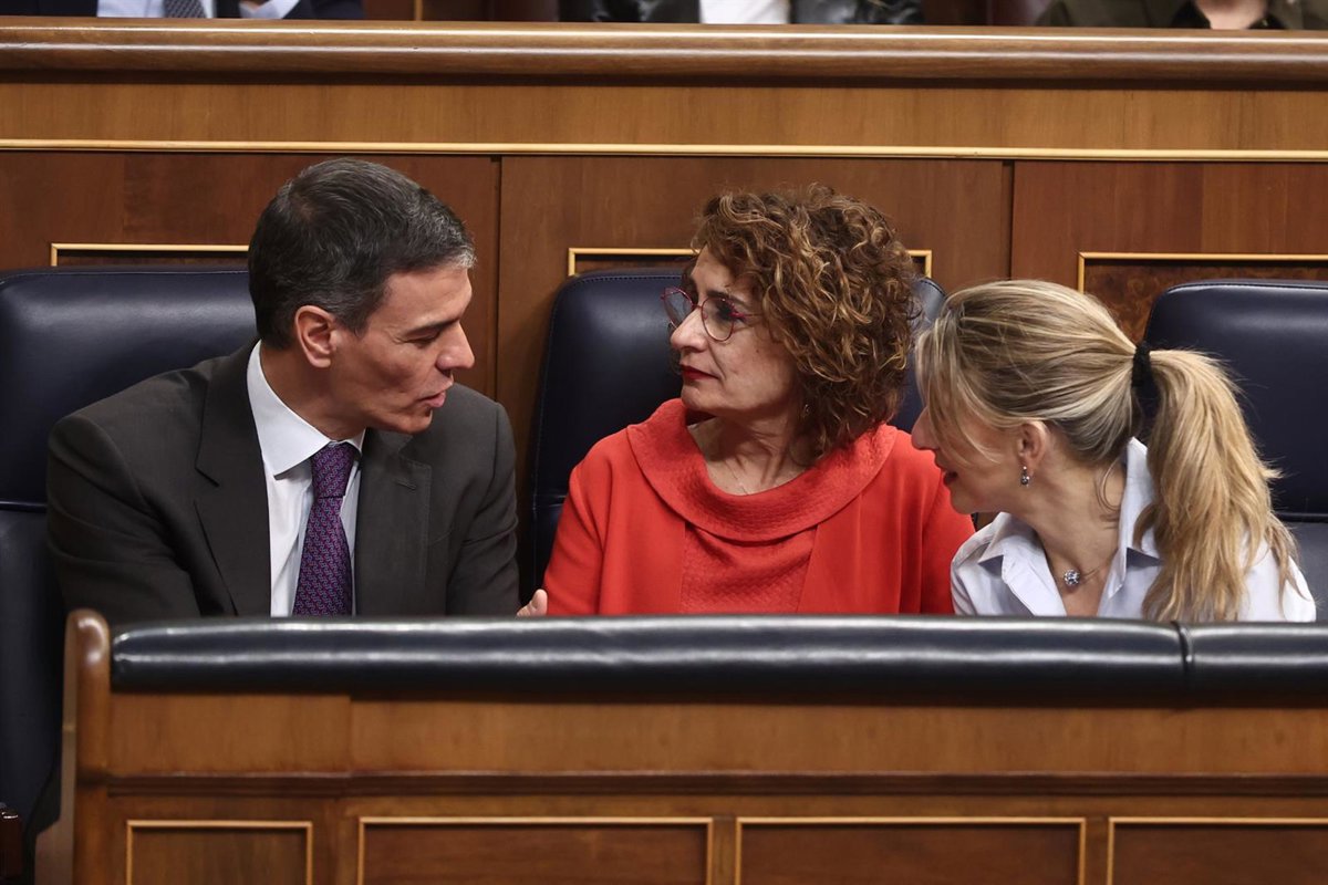(I-D) El presidente del Gobierno, Pedro Sánchez; la vicepresidenta primera y ministra de Hacienda, María Jesús Montero, y la vicepresidenta segunda y ministra de Trabajo y Economía Social, Yolanda Díaz, durante una sesión de control al Gobierno, en el Con - Eduardo Parra - Europa Press