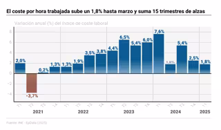 El coste por hora trabajada subió un 1,8% en el primer trimestre de 2025 respecto al mismo periodo de 2025, tasa 0,7 puntos inferior a la del trimestre previo, según los datos provisionales del Índice de Coste Laboral Armonizado (ICLA) publicados este martes por el Instituto Nacional de Estadística (INE).