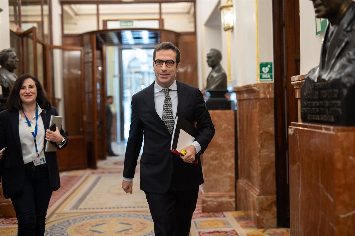 El ministro de Economía, Carlos Cuerpo, llega a una sesión plenaria, en el Congreso de los Diputados, a 8 de mayo de 2025, en Madrid (España). El Congreso debate y vota hoy la convalidación o derogación del Real Decreto ley 4/2025, de medidas urgentes de - Alejandro Martínez Vélez - Europa Press