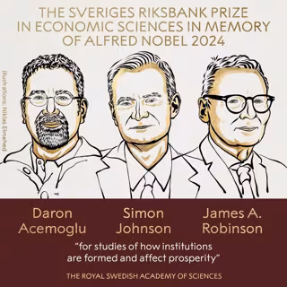 La Real Academia Sueca de Ciencias ha decidido otorgar el Premio Sveriges Riksbank en Ciencias Económicas en memoria de Alfred Nobel 2024 a Daron Acemoglu, Simon Johnson y James A. Robinson "por sus estudios sobre cómo se forman las instituciones y cómo afectan la prosperidad".