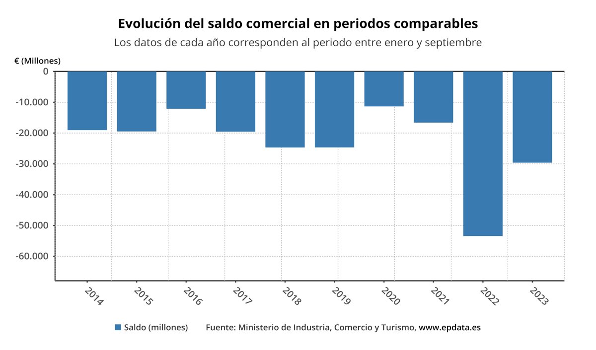 El saldo no energético arrojó un déficit de 4.718 millones de euros hasta septiembre, frente al saldo negativo de 13.380 millones de euros del mismo periodo del año anterior, en tanto que el déficit energético se redujo hasta los 24.878 millones de euros.