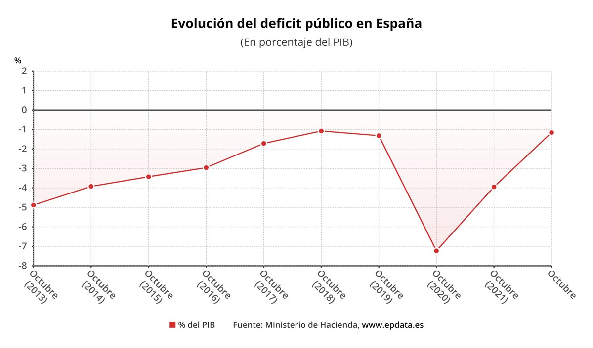 El déficit conjunto de la Administración Central, la Seguridad Social y las comunidades autónomas, excluida la ayuda financiera, se situó en 15.168 millones de euros en los diez primeros meses del año, lo que supone el 1,16% del PIB --frente al 4,41% del mismo periodo de 2021-- y un descenso del 71,5% respecto al año anterior.