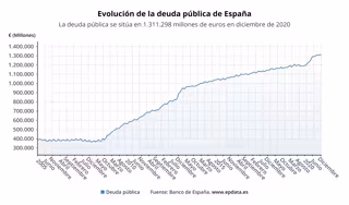 En términos interanuales (diciembre de 2020 sobre el mismo mes de 2019), la deuda pública se ha incrementado en 122.439 millones de euros (+10,3%) por los mayores gastos y los menores ingresos derivados de la crisis del coronavirus.