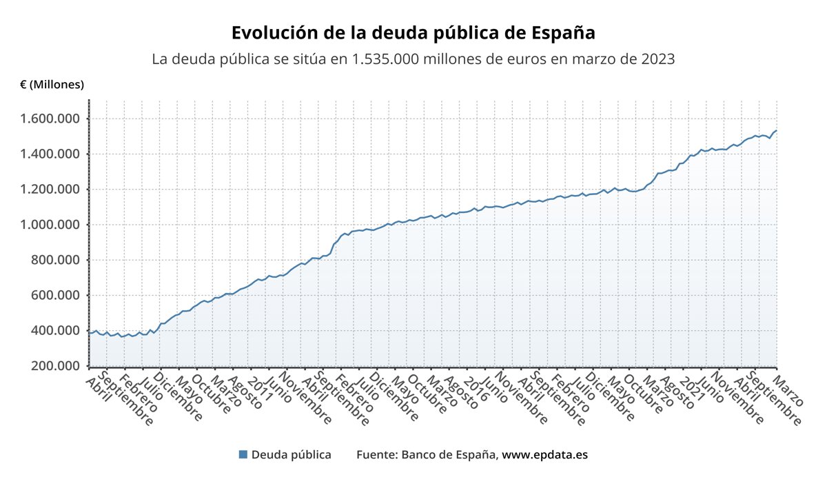 En el último año, la deuda pública ha crecido un 5,6%, con 81.540 millones de euros más, como consecuencia de los menores ingresos y los mayores gastos derivados, primero, de la crisis de la pandemia y, posteriormente, de las consecuencias económicas de la guerra en Ucrania y el alza de precios.