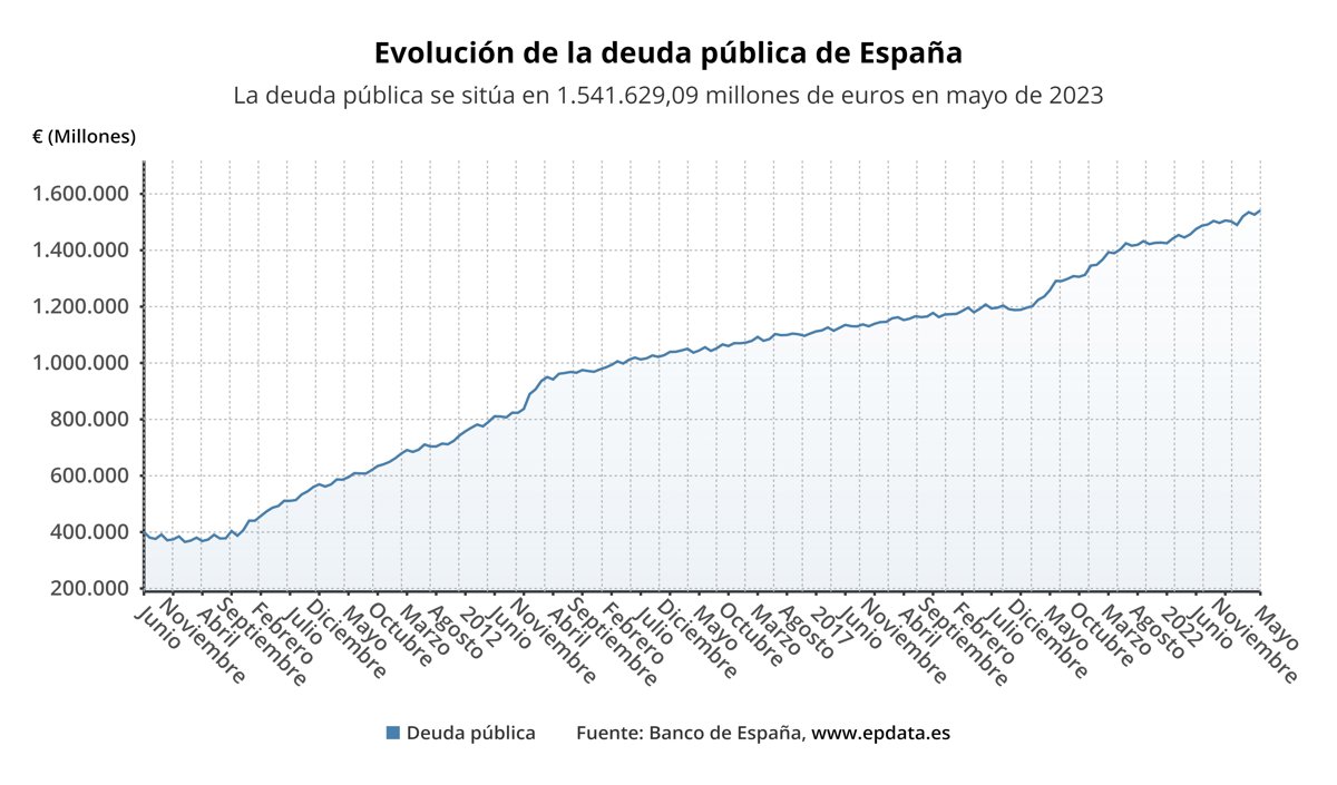 En el último año, la deuda pública ha crecido un 5,8%, con 85.176 millones de euros más, como consecuencia de los menores ingresos y los mayores gastos derivados de la crisis de la pandemia y por la guerra en Ucrania y la subida de precios.
