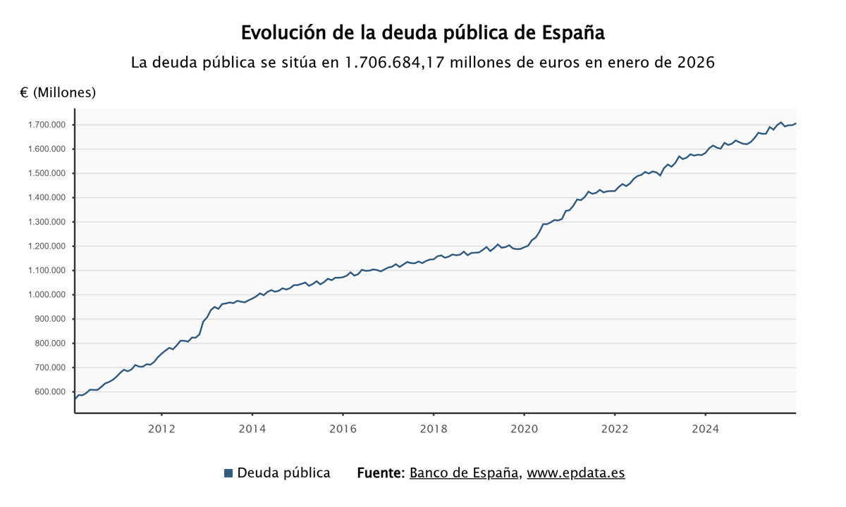 En términos absolutos, el saldo de la deuda (1,707 billones) aumentó un 4,7% respecto al mismo mes de enero del año pasado, al tiempo que registró un incremento del 0,5% respecto al mes de diciembre.