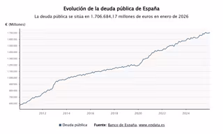 Respecto a las administraciones territoriales, la deuda de las comunidades autónomas fue de 338.543 millones de euros en enero de 2026, equivalente a un 20% del PIB, con una variación interanual del 1%, mientras que la deuda de las corporaciones locales se situó en 20.786 millones de euros en este mes (1,2% del PIB), un 9,2% inferior al importe registrado un año antes.