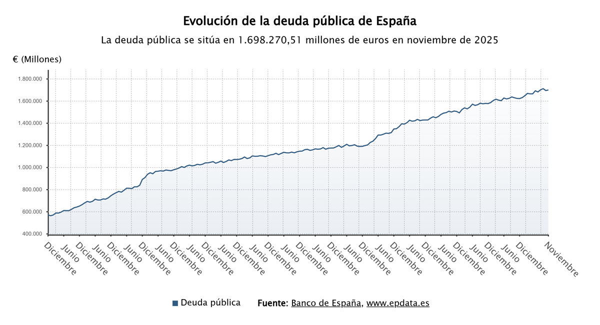De acuerdo con los datos publicados este viernes por el Banco de España, en términos absolutos, el saldo de la deuda (1,698 billones) aumentó un 4,7% respecto al mismo mes del año anterior, al tiempo que registró un incremento del 0,3% respecto al mes de octubre.
