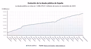 Respecto a las administraciones territoriales, la deuda de las comunidades autónomas fue de 339.131 millones de euros en noviembre de 2025, equivalente a un 20,3% del PIB, con una variación interanual del 1,3%, mientras que la deuda de las corporaciones locales se situó en 22.049 millones de euros en este mes (1,3% del PIB), un 3,7% inferior al importe registrado un año antes.