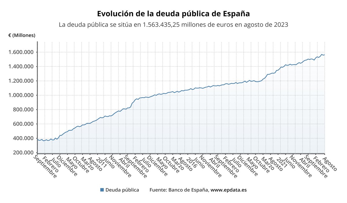 La deuda del conjunto de las administraciones públicas alcanzó en agosto los 1,563 billones de euros, tras elevarse un 0,4% en tasa mensual, aunque no superó el máximo histórico registrado en junio (1,568 billones), según los datos publicados este lunes por el Banco de España.