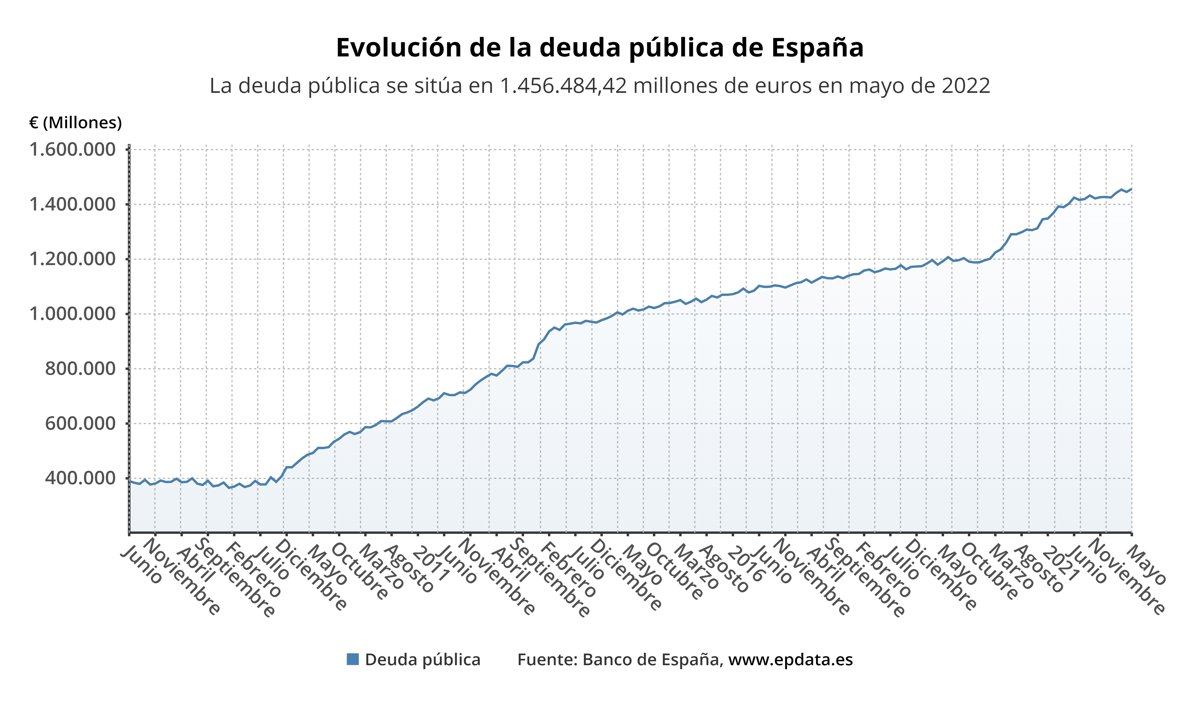En el último año, la deuda pública ha crecido un 3,8%, con 53.979 millones de euros más, como consecuencia de los menores ingresos y los mayores gastos derivados de la crisis de la pandemia y más recientemente por la guerra en Ucrania.