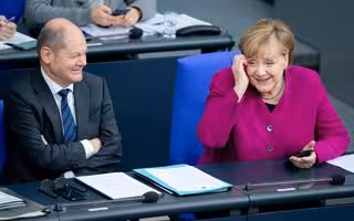 La canciller alemana, Angela Merkel, y el ministro de Finanzas, Olaf Scholz, sonríen durante una sesion del Bundestag en 2019 - Kay Nietfeld/dpa - Archivo