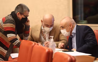El secretario general del PSOE en el Congreso, Rafael Simancas (d), conversa durante la Comisión de Presupuestos con María Carvalho (ERC) y Txema Guijarro (Unidas Podemos) - EUROPA PRESS/E. Parra. POOL - Europa Press