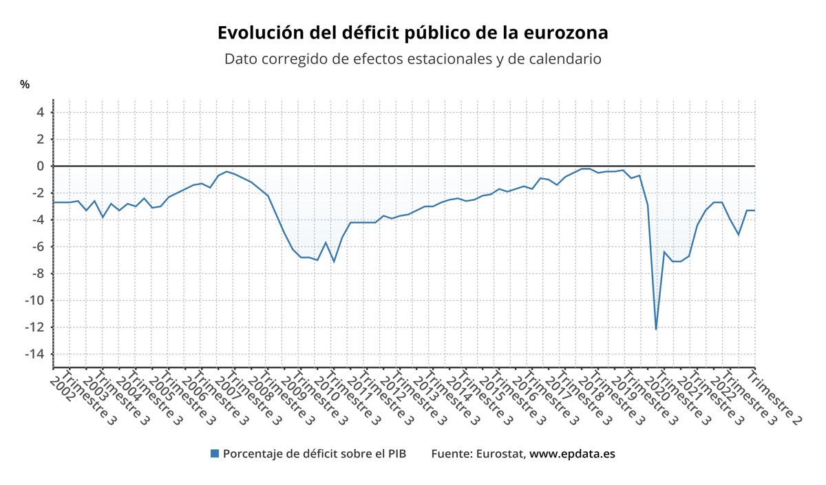 La zona euro mantuvo estable su déficit presupuestario en el segundo trimestre del año en el 3,3% del PIB, mientras que alivió su endeudamiento al 90,3% desde el 90,7% del primer trimestre, lo que supone su nivel más bajo desde el primer trimestre de 2020, coincidiendo con el estallido de la pandemia de Covid-19, cuando la deuda de la eurozona era del 86,2%.