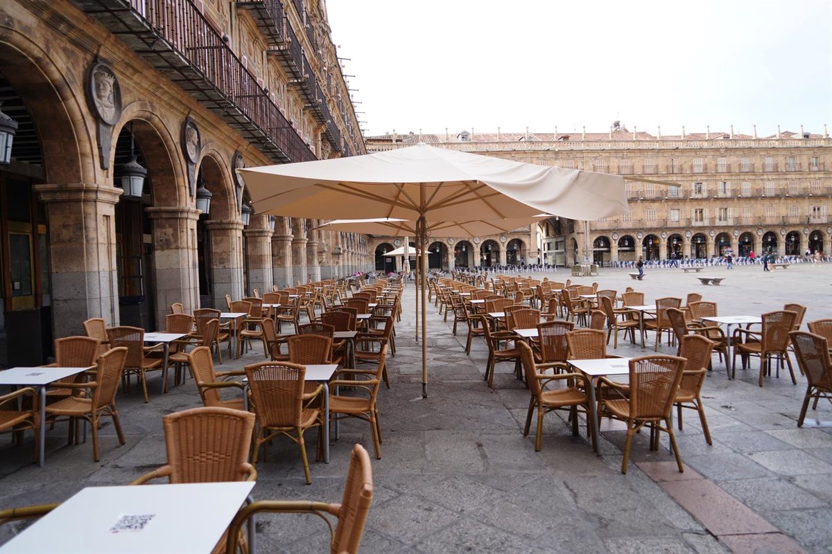 Archivo - Terraza vacía en la Plaza Mayor de Salamanca durante el primer día de confinamiento perimetral y medidas restrictivas en la ciudad de Salamanca que se extenderán por un periodo inicial de 14 días, en Salamanca, Castilla y León (España) a 17 de o - Manuel Ángel Laya - Europa Press - Archivo