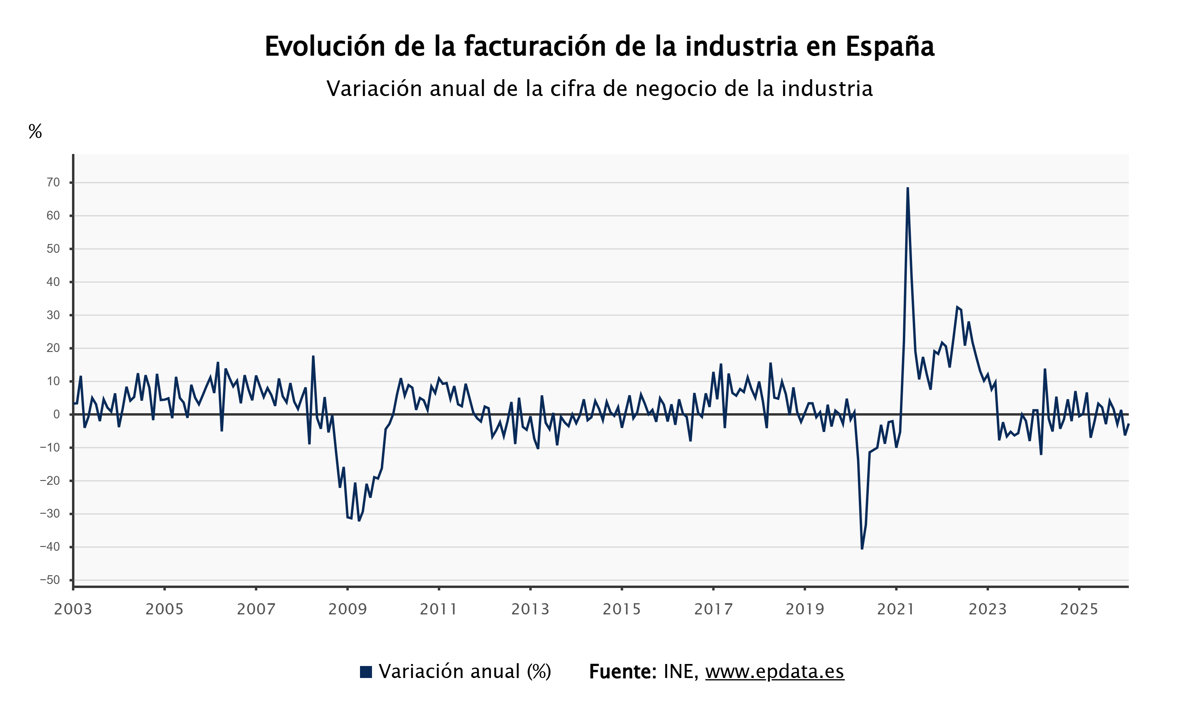 La cifra de negocios de la industria bajó un 2,7% en febrero en relación al mismo mes de 2025, amortiguando en más de tres puntos la caída que experimentó en enero (-6,3%), según los datos difundidos este viernes por el Instituto Nacional de Estadística (INE).