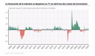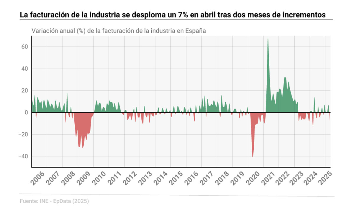 La cifra de negocios de la industria bajó un 7% en abril en relación al mismo mes de 2024, su mayor retroceso interanual desde marzo de 2024, cuando se desplomó un 12,2%, según los datos difundidos este viernes por el Instituto Nacional de Estadística (INE).