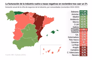 La cifra de negocios de la industria bajó un 2% en noviembre de 2024 en relación al mismo mes de 2023, tasa que contrasta con el repunte del 4,5% registrado en octubre, según los datos difundidos este viernes por el Instituto Nacional de Estadística (INE).