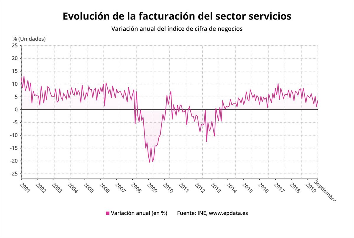 El sector servicios registró un aumento de su facturación del 3,6% el pasado mes de septiembre en relación al mismo mes de 2018, tasa 2,4 puntos superior a la de agosto, cuando se registró el menor ritmo de crecimiento en tres años.