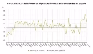 Variación anual de número de hipotecas firmadas en España (INE) - EPDATA