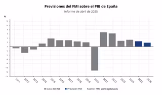 El Fondo Monetario Internacional (FMI) prevé que España crezca un 2,5% en 2025 y un 1,8% en 2026, lo que equivaldría a una desaceleración desde el 3,2% registrado en 2024 al moderarse las exportaciones y la población total en edad de trabajar, pero, también, supone una revisión al alza de dos décimas para este año.