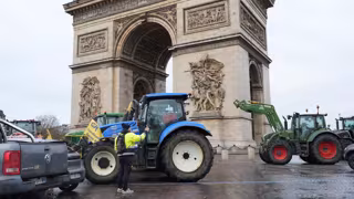 Varios tractores frente al Arco del Triunfo, a 8 de enero de 2026, en París (Francia), en protesta por el acuerdo con Mercosur. - Ana López