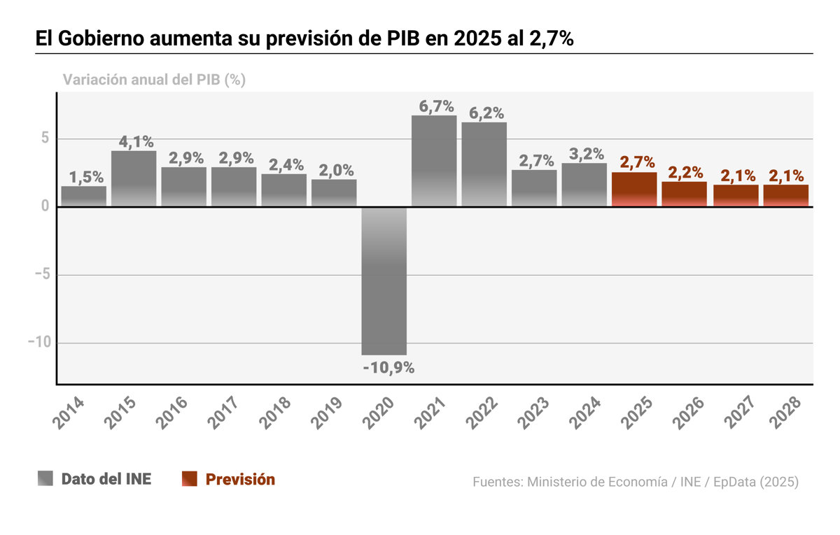 El ministro ha indicado que, con esa actualización al 2,7% para 2025, y con tasas de crecimiento continuadas por encima del 2% en los años siguientes, la economía española crecerá "muy por encima" de sus principales socios.