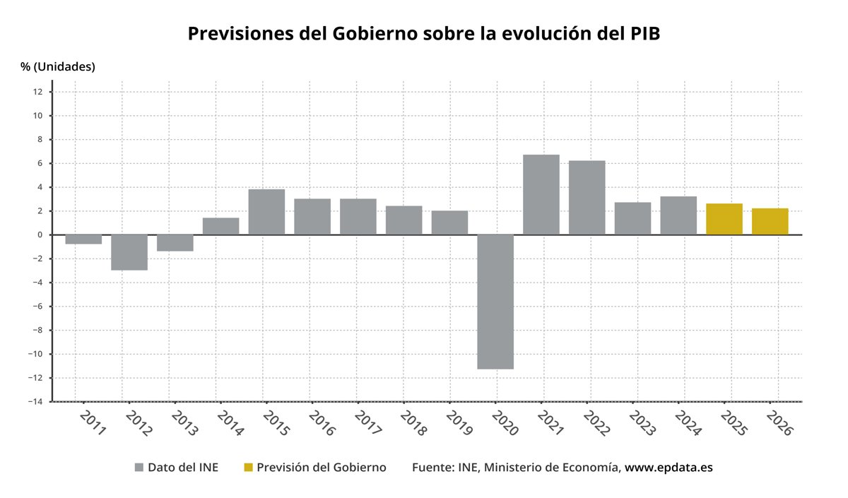 El Gobierno ha destacado el dinamismo de la economía española y ha decidido mantener sus previsiones de crecimiento del Producto Interior Bruto (PIB) en el 2,6% en 2025 y en el 2,2% en 2026, a pesar de la incertidumbre global derivada de los aranceles y del posible impacto del apagón eléctrico del lunes.