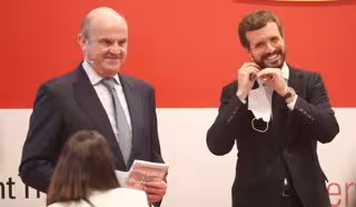 El presidente del PP, Pablo Casado (d) y el vicepresidente del BCE, Luis de Guindos (i), durante la presentación del libro del senador y abogado Fernando Martínez-Maíllo, en la Fundación ONCE, en Madrid (España), a 17 de julio de 2020. - Eduardo Parra - Europa Press