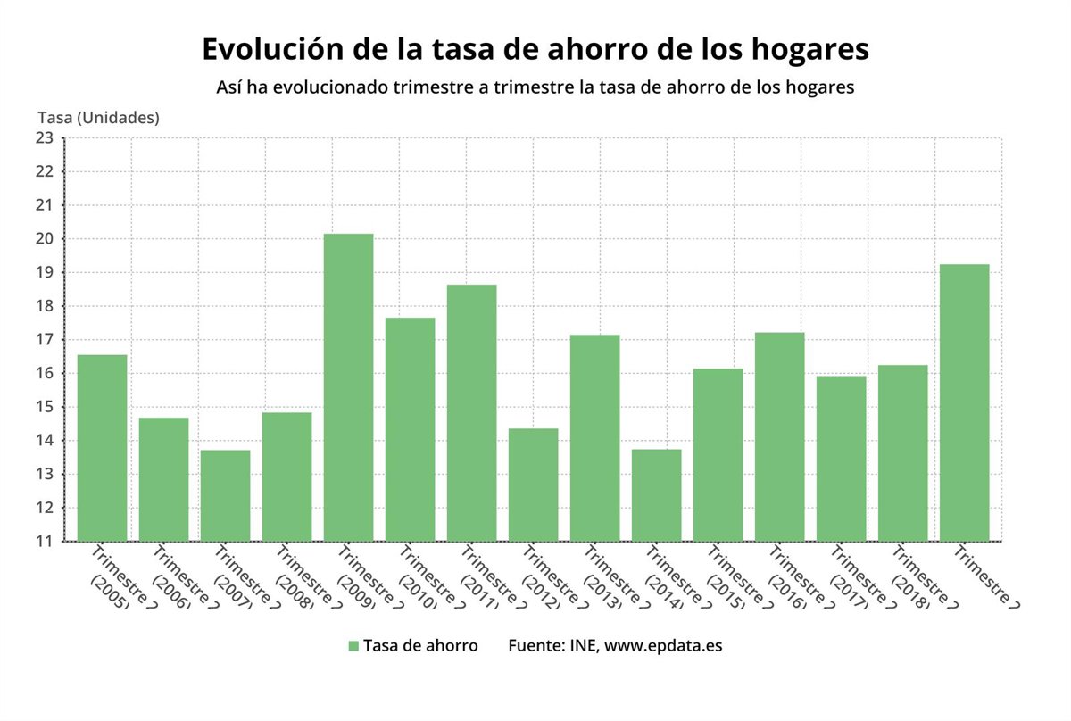 En concreto, el ahorro de los hogares se situó en 41.984 millones de euros, frente a los 33.513 millones de euros del segundo trimestre de 2018, lo que supone un incremento del 25,3%.
