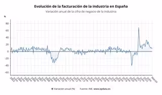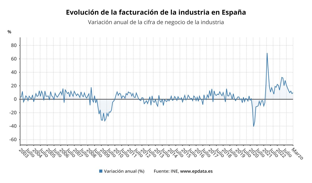 Con el avance interanual de marzo, 1,3 puntos superior al de febrero, la facturación de la industria suma ya 25 meses consecutivos de ascensos tras haber encadenado anteriormente un año de tasas interanuales negativas por la crisis del Covid.