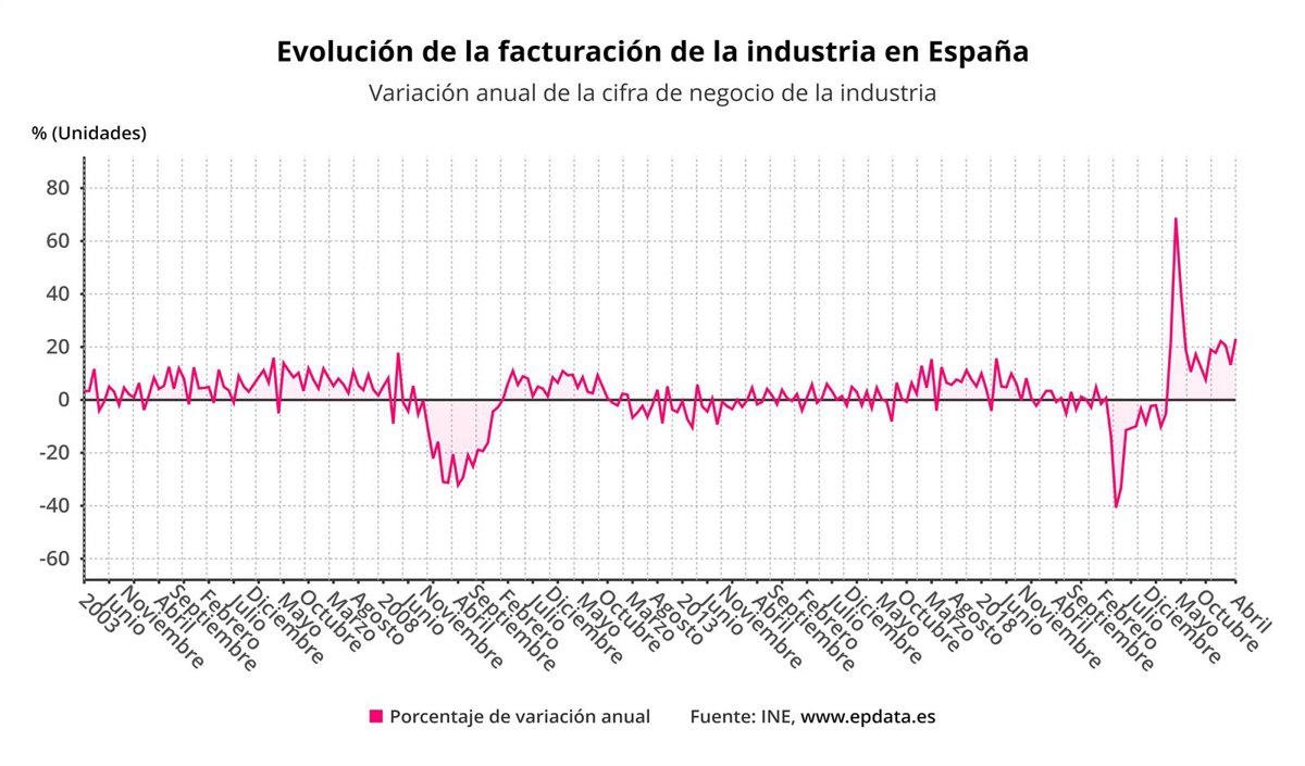 La cifra de negocios de la industria subió un 23,1% en abril respecto al mismo mes de 2021, tasa 9,5 puntos superior a la de marzo y la más elevada desde mayo del año pasado, según datos difundidos este miércoles por el Instituto Nacional de Estadística (INE).